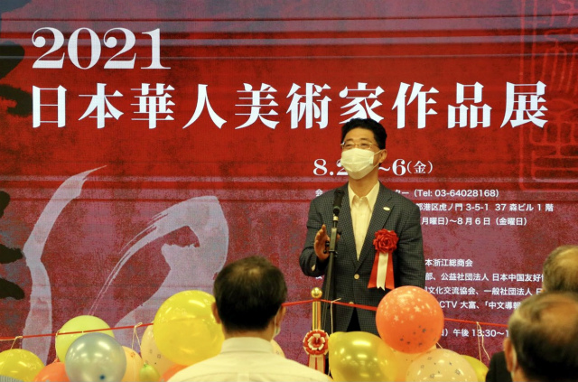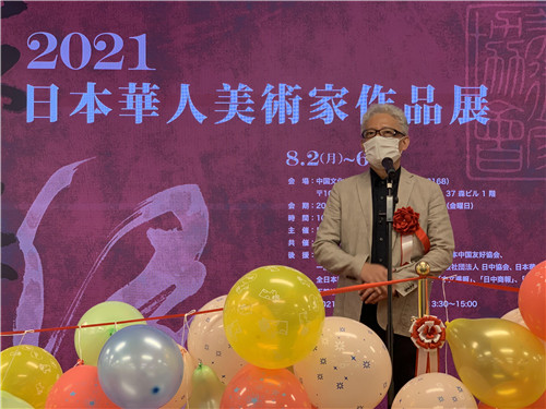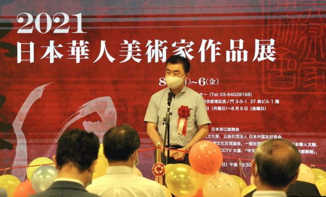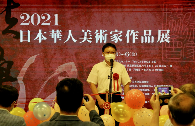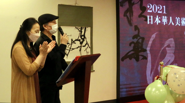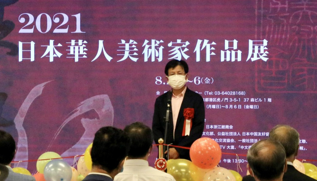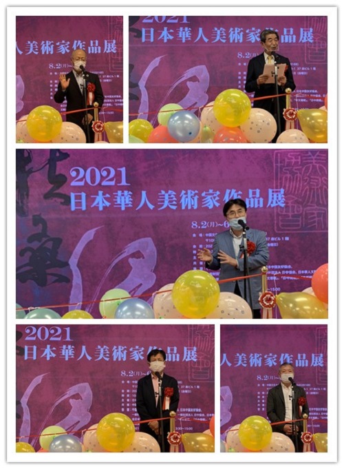 开幕式上,首先播放了中国驻日本大使馆文化部石永菁公使衔参赞的祝贺视频,她由于疫情限制而未能出席。石公参在祝辞中讲到:首先代表中国驻日本大使馆,祝贺“扶桑缘~2021・日本华人美术家作品展”开幕,预祝展会取得圆满成功!在东京奥运会举办期间、在新冠疫情仍未消退的特殊时期,举办这样的作品展意义重大。参展画家们都具有相当的专业水平和丰富经验,展会起到了促进中日两国文化艺术交流的窗口和桥梁作用。明年将举办北京冬奥会,也是中日邦交正常化50周年,衷心祝愿艺术家们更加活跃,为中日两国的友好交流做出贡献!