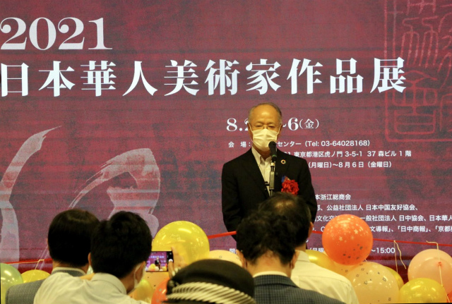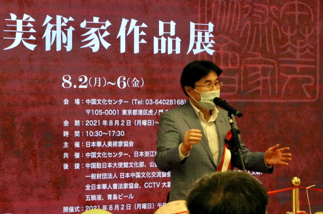 日本华人美术家协会会长卓民代表日本华人美协讲话。他首先感谢在如此严峻的情况下赶来出席开幕式的嘉宾和同仁们。他同时强调: “中日兩国一衣带水,并非只是一个空洞抽象的词语。它是由千百年來难以计数的中日先哲和精英们在社会、人文、经济、艺术等各方面林林总总的交流累计凝聚而成。今天,这一文脉和精神正由于我们这些在日华人艺术家们的继承和延续中,更深更广,源远流长。十年、二十年、三十年前,我们这一代所谓的新华侨华人來自中国的四面八方。大家的出身、学历各异,來日后的经历、境遇不同,但身上都流淌着华夏的血液。这个被誉为上世紀80年代崛起于海外的‘中国海外艺术军团’,在汲取‘一衣带水的’邻国文化艺术营养的同时,又坚守着东方艺术的精髓。我们在异国他乡辛勤耕耘、融会贯通、图新创作、硕果累累。这些个体点点滴滴的努力,潺潺不绝似溪水泉涌,如涓涓細流汇入中日友好的大潮中。每一位个体的辛劳足迹,将流传为美好回忆。”