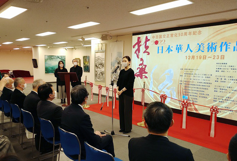 当天,在中国文化中心举行了作品展开幕仪式。驻日使馆文化公参陈诤,一般社团法人日中协会理事长濑野清水,公益社团法人日中友好协会常务理事永田哲二,日中文化交流协会事务局次长吉野彩美,中国文化中心主任罗玉泉,全日本华侨华人社团连合会执行会长林立,全日本华人书法家协会主席高小飞,在日华人摄影交流协会会长冯学敏,中文导报社长、总编杨文凯,著名旅日艺术家李文培,上海市吴昌硕基金会理事长吴超,日本华人美术家协会会长卓民,日本华人美术家协会的出展艺术家,以及中日艺术爱好者约30名嘉宾参会。