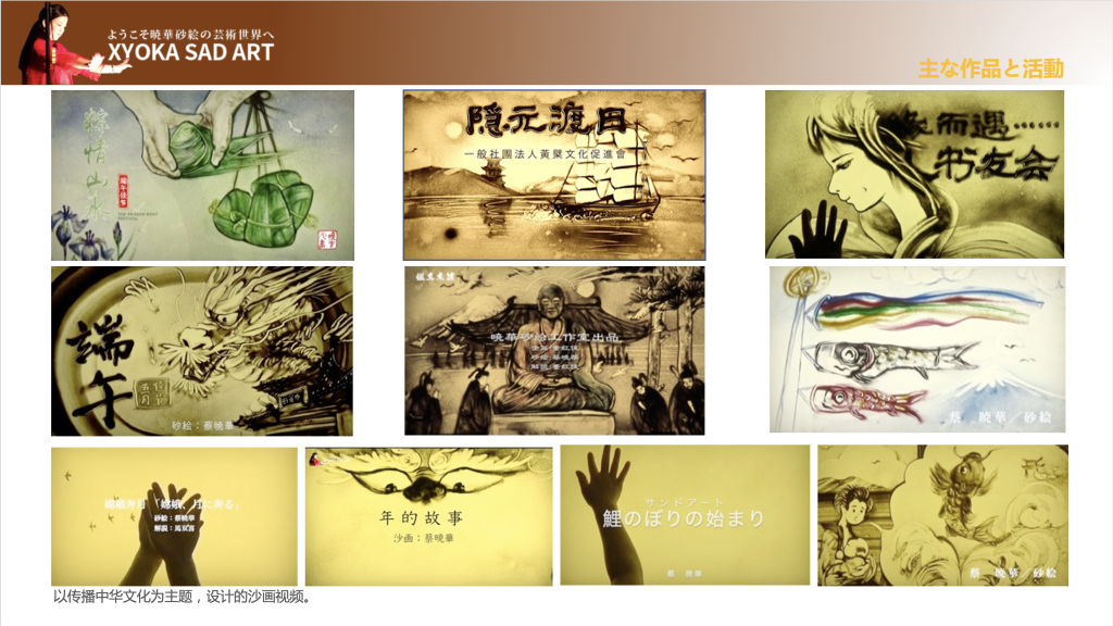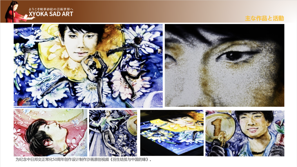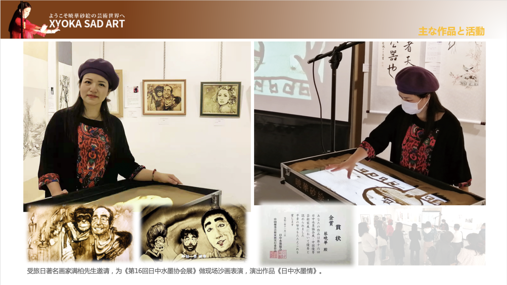 • 2016年 成立了“晓华沙画工作室”,致力于在日本推广沙画艺术。作为第一位旅日中国沙画艺术家,活跃在中日之间的各种文化艺术交流活动中。