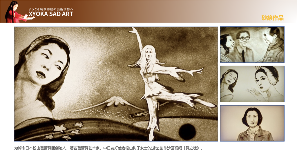 • 为悼念日本松山芭蕾舞团创始人、著名芭蕾舞艺术家、中日友好使者松山树子女士逝世创作沙画视频《舞之魂》