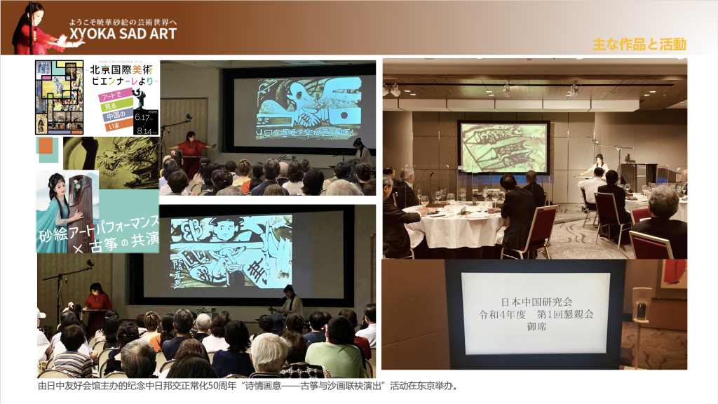 • 在日中友好会馆主办的纪念中日邦交正常化50周年“诗情画意——古筝与沙画联袂演出”活动中与旅日古筝演奏家谢雪梅联袂表演,现场共有约260位日本观众观看