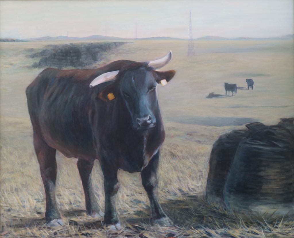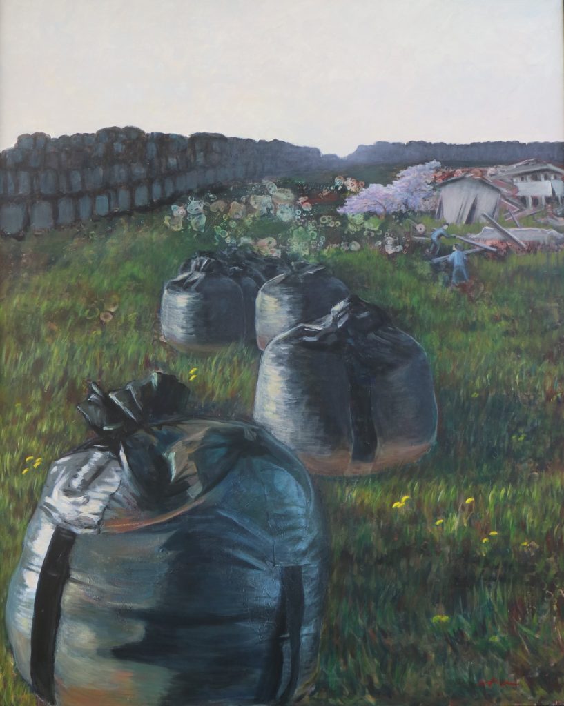 2017年,她又描绘了堆放核污染袋的福岛风景《夏》,再次获同展“奖励赏”。此次创作之后,佟大生深感必须亲赴福岛,亲眼看看福岛的现状,了解现地人们的所思所想,才有资格继续表现这个题材。于是她想方设法找到了热心的现地向导,访问了郡山市和浪江町,和事故现场至近距离的“希望的牧场”。几年来多次采访了坚守牧场的场长吉泽夫妇和当地的市民,并努力把采访中得到的素材在作品中表现出来。