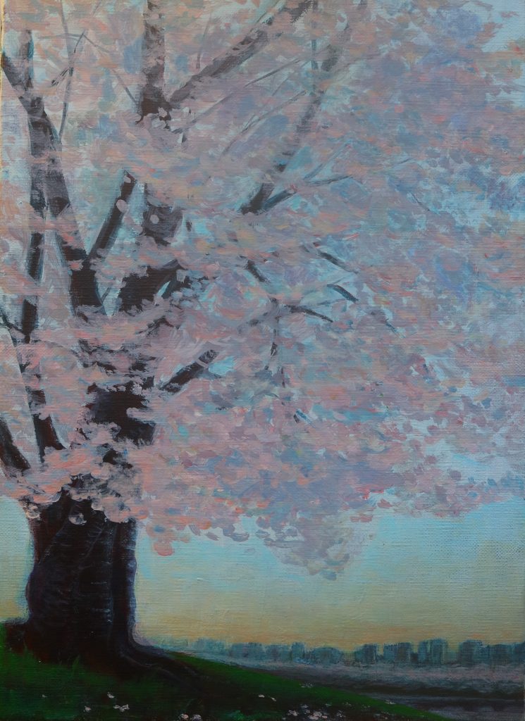 2013 年一个偶然的契机,在家人的提议下,她出品了二科展,意外入选深受鼓励,积极作画参展渐入佳境。并考虑尝试主题性创作。她因育儿为契机开始关注环保问题,3.11大地震所引发的,震惊世界的放射能污染事故,更激发了她强烈的创作欲望。同时这沉重的主题具有极大的挑战性和压力。在她踌躇之际,得到了二科会生方纯一先生强有力的助言和激励,之后她师事于生方先生,并开始了持续七年的《勿忘福岛系列》的创作。