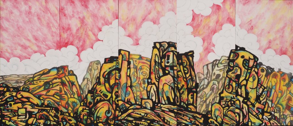 创作主要题材为人类与社会关系,以及人类与文化相关的风景、抽象作品。作品深受东京和北京、香港藏家的喜爱。